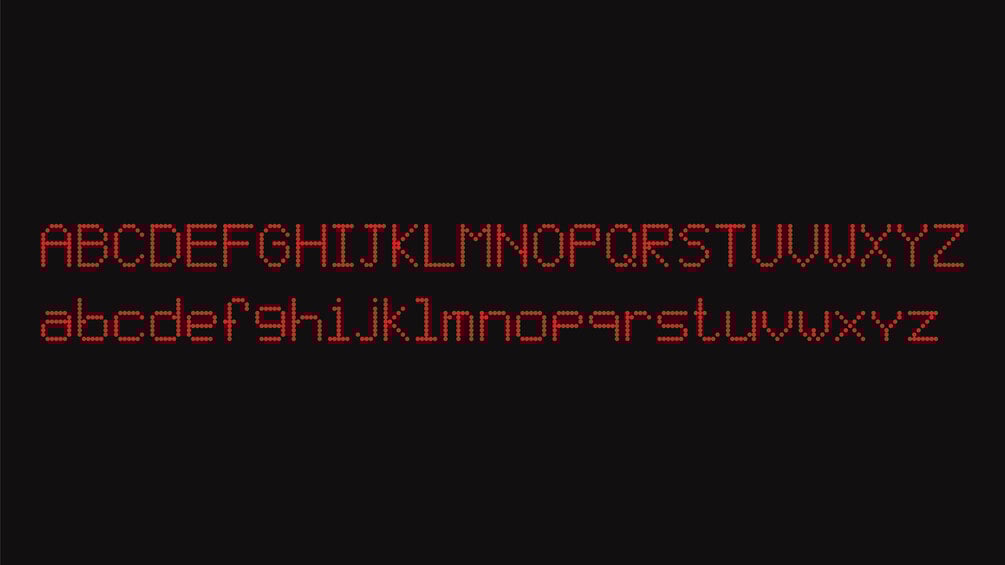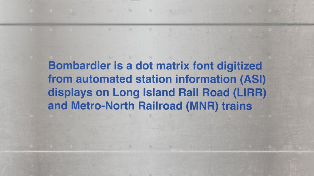 Bombardier is a dot matrix font digitized from automated station information (ASI) displays on Long Island Rail Road (LIRR) and Metro-North Railroad (MNR) trains. Constructed using a seven-by-ten dot grid, the letters are sourced from the destination displays on the exteriors of LIRR M7 and MNR M7A train cars.
